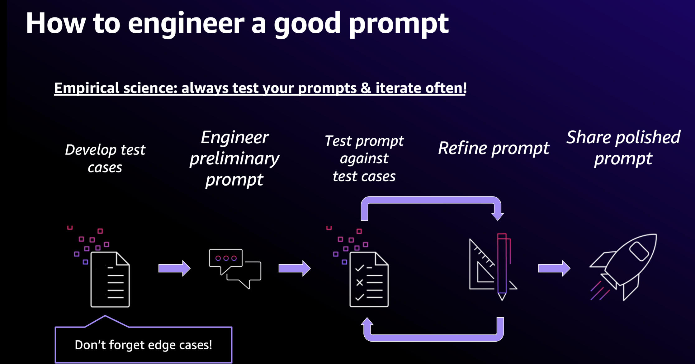 Back in 2024, I spent a lot of time talking to customers about how they could engineer their prompts to create better and, importantly, more reliable results from their model invocations, allowing them to scale use cases for enterprise applications. At the time, I always presented the slide below talking about how test and test-driven prompt engineering enables evolution of their applications and allows them to benefit from new models and model versions.